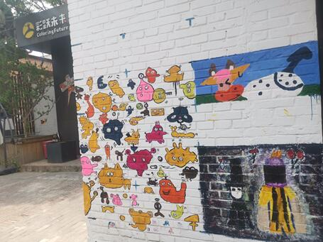 我们的学校位于798艺术区,旺季门前人流如织,学校门前有一面十多米长的白墙,很适合做宣传,但是过去半年,就墙上的宣传内容大家一直争论不休,所以墙一直空着,实乃一大憾事。直到今年6月,校长提议,何不把这面墙交给孩子,让他们用自己的画笔在798这个艺术殿堂留下印记。坦率地讲,初次听到这个意见我有些犹豫,把一个寸土寸金,挂几块广告牌也能一年赚几十万的地方,让给孩子?但最终,我们还是同意了这个建议。半个月之后,墙壁彩绘初具规模,学员的学习热情大有提高,家长开心,游客争先来拍照,俨然此地成为798的一个新地标。
