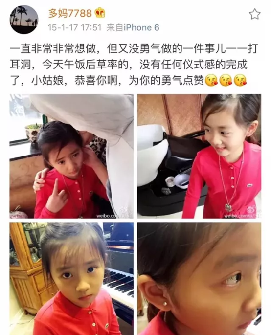 黄磊和孙莉是名副其实的开明父母,开明到一般正常父母可能接受不了。多多在9岁的时候完成了自己的一个心愿,就是打耳洞。孙莉是这样发微博的:一直非常非常想做,但又没勇气做的一件事——打耳洞,今天午饭后草率的,没有任何仪式感的完成了,小姑娘,恭喜你啊,为你的勇气点赞。看,孙莉不是说容许或者不容许多多打耳洞,而是以赞扬孩子勇气的形式鼓励孩子做恰当的事情,尊重孩子正常的想法。