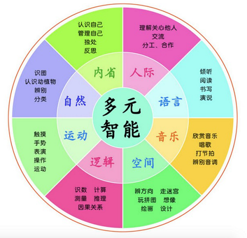 根据加德纳的多元智能理论,作为个体,我们每个人都同时拥有相对独立的八种智能(见下图),正是这八种智能在每个人身上以不同方式、不同程度组合,使得每一个人的智能各具特点。