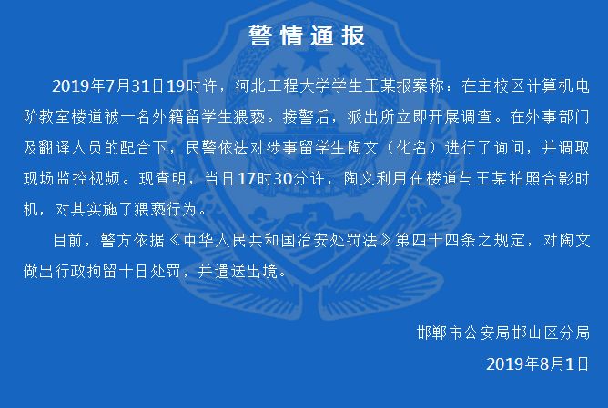 2019年7月31日19时许,河北工程大学学生王某报案称:在主校区计算机电阶教室楼道被一名外籍留学生猥亵。接警后,派出所立即开展调查。在外事部门及翻译人员的配合下,民警依法对涉事留学生陶文(化名)进行了询问,并调取现场监控视频。现查明,当日17时30分许,陶文利用在楼道与王某拍照合影时机,对其实施了猥亵行为。