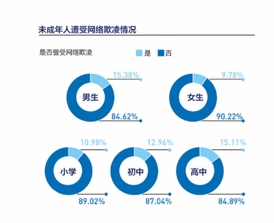 在游戏App中,同样存在相应问题。报告中提到,有12.47%的受访学生表示曾遭受网络欺凌,而且男性受欺凌的比例更高。随着年龄增长,认为自己有过网络欺凌遭遇的未成年人也更多。