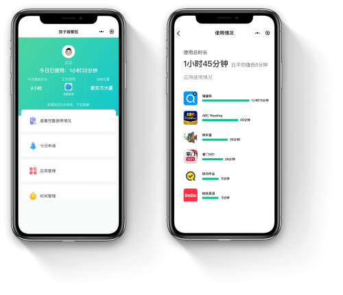 除了这些基础的管控,如果您的孩子有自己的手机。还可以通过微信小程序对他进行远程管控。只需微信扫码与孩子的手机进行绑定,就可以通过“猫头鹰管家”的微信小程序随时查看孩子使用手机的情况了。比如孩子现在已经使用手机多长时间了,正在使用哪个应用,在什么位置等等。