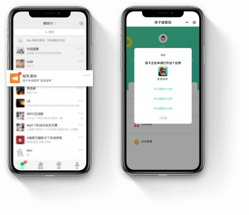除此之外,如果孩子不在家长身边,还想使用被管控的应用,就可以发送远程申请,家长的微信会马上收到通知。在小程序里就可以完成同意或者拒绝的操作。