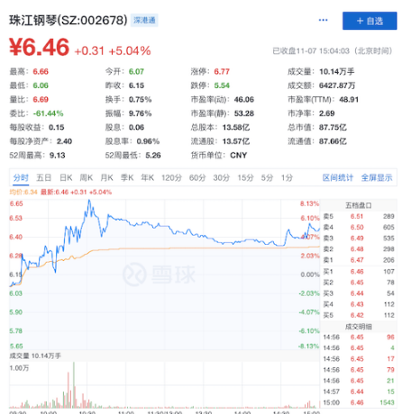 公告发布后,珠江钢琴股价上涨。截止发稿,股价报6.46元/股,上涨5.04%。