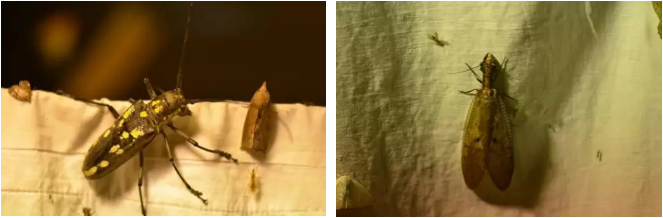 灯光一打开,整个院子被照亮得一览无余。一开始,入场光临的只有蚊子和小飞蛾;几分钟后,才有一些小型的金龟和小型的螽斯闻讯赶来;紧接着,白天耀武扬威的八星虎甲、低调朴素的夜蛾也应邀赴会;最晚赶来的是慢慢吞吞的大型条螽斯、凶神恶煞的星齿蛉、霸气外露的大锹甲、奇颜异色的大型蛾子;那些迟到的就是羽化不久的柞蝉先生、艳丽高冷的姬螳螂小姐、简朴低调的棕静螳小哥。