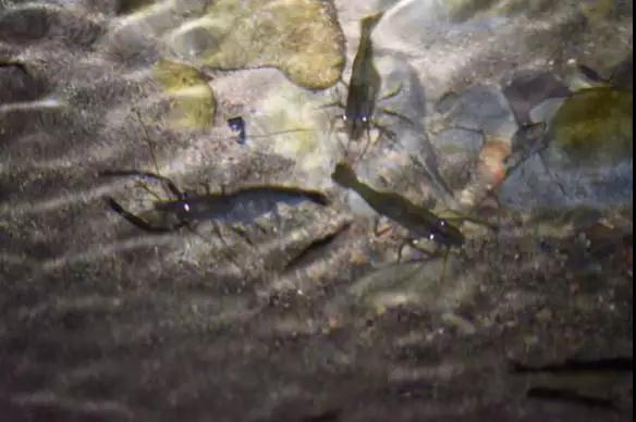 “快看,长臂虾!”大胖王舒睿拿着手电筒照着水底。哟,三五只沼虾在水底爬行像是翻草机。再看看,颜色都不一样,有的是橙红色,有的是蓝白色、有些是米黄色、还有靛紫色的。我推测,这是生活环境不同造成体色差异如此之大。