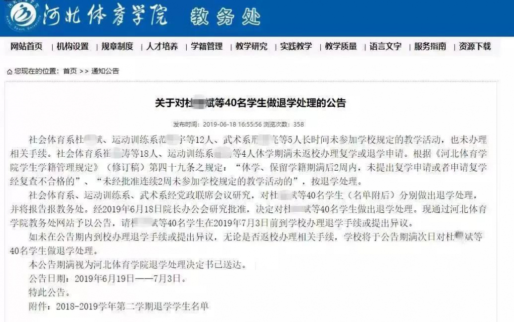 社会体育系、运动训练系、武术系经党政联席会议研究,对杜某斌等 40 名学生分别做出退学处理,并将报告报教务处。经 2019 年 6 月 18 日院长办公会研究批准,决定对杜某斌等 40 名学生做出退学处理。现通过河北体育学院教务处网站予以公告,请杜某斌等 40 名学生在 2019 年 7 月 3 日前到学校办理退学手续或提出异议。