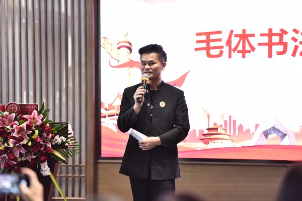 活动还有幸邀请到联合国文化艺术委员会主席团主席、清华大学研究生院战略发展顾问黄天亮教授为此次活动致辞,以及现任中国书法家协会理事、广东省毛体书法家协会副主席、深圳市毛体书法家协会副主席、佛山市阳江商会常务理事、阳江市毛体书法培训创业基地创始人林冠宏在交流会上向参会嘉宾讲解了毛体书法的特点,并现场作出展示。