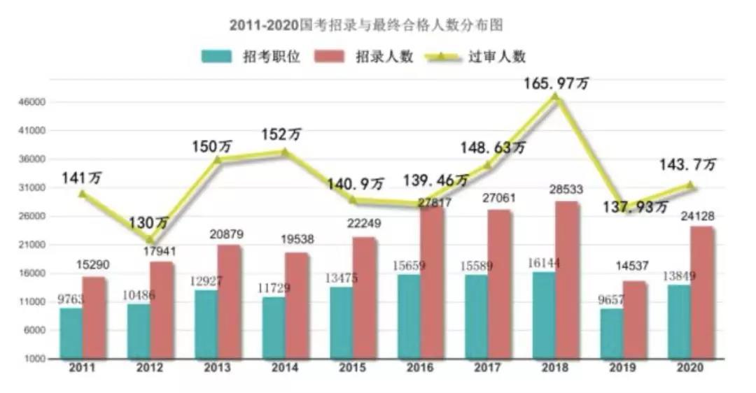 自2009年度国考报名通过审核人数达105.2万、首次突破100万起,此后的很长一段时间,国考报名过审人数一直在高位运行:2016年度国考,共有139.46万人通过资格审查;2017年度则有148.63万人获得参加考试资格;到了2018年度,共有165.97万人通过资格审查。