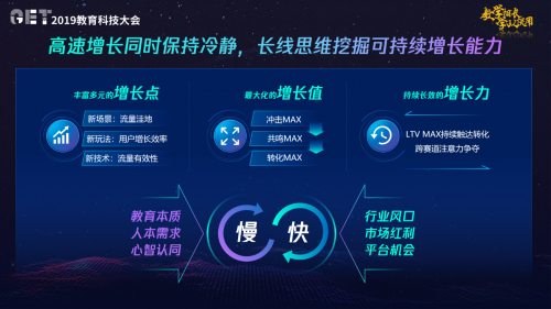 教育行业为何能一路逆风猛进?“快”起来的教育行业,又能否实现高增速与“慢”行业本质的平衡?在11月25日-26日举办的“GET2019教育科技大会”上,腾讯广告大客户销售运营总经理张敏毅与腾讯广告大客户运营高级总监李小轲作为分享嘉宾,与数千名教育行业从业者共同探讨教育行业如何从营销层面“快”、“慢”兼顾,长线布局。