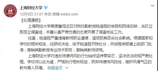 12月9日晚9时许,上海财经大学发布处理通报。通报称: