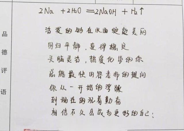 再看第二位班主任所写的评语(上图)。虽然第一行的一大坨,哦不,一大行的内容一些朋友不太理解:为何化学方程式会出现在学生的评语栏里呢?其实,化学方程式放在学生的评语栏中,也能起到一定的“化学反应”。虽然这位班主任的字不如第一位班主任写得那么遒劲、干净,但这位化学老师兼班主任的脑回路却是相当清奇的,很多网友感叹:这位班主任老师也太有才了吧!